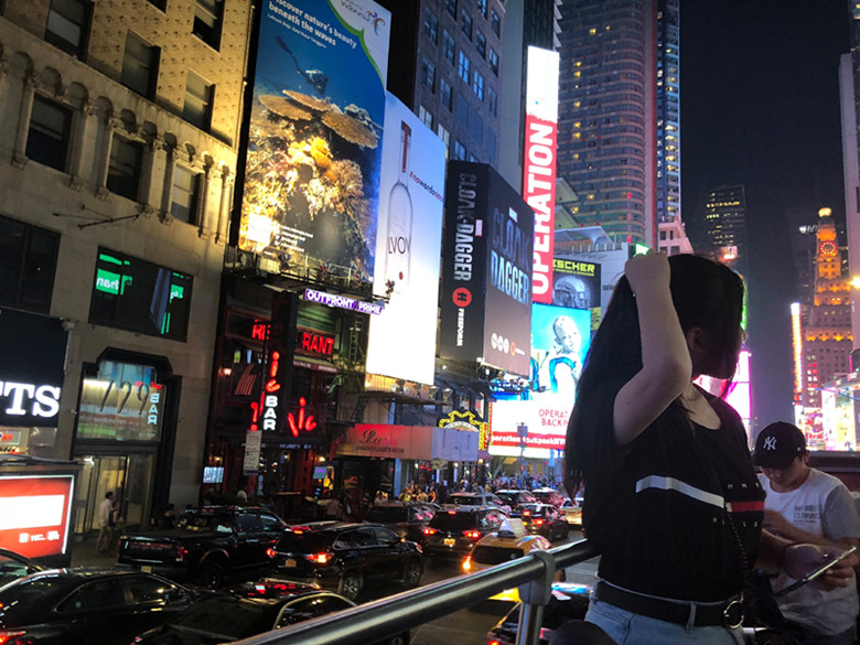 我们选择在晚上乘坐观光巴士游览纽约的市中心-曼哈顿,巴士停靠在时代广场,巨大的电子广告牌和各色的路灯、招牌,给人时光琉璃、璀璨绚烂的迷幻感。