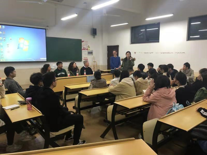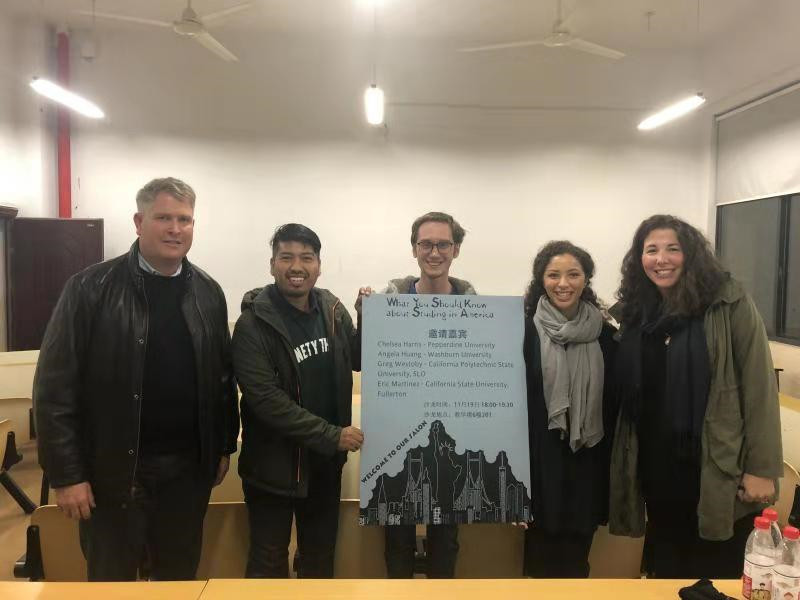11月19日晚上,学院第二届国际文化月第四场活动“美国大学主题沙龙”在教学楼6幢201举行。本次活动特邀四位美国籍外教嘉宾跟同学们交流美国大学的学习生活趣事,由学院外教Artur主持。