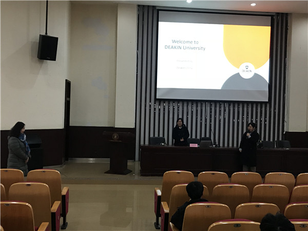 12月13日下午,学院第二届国际文化月最后一场活动“澳大利亚迪肯大学宣讲会”在28幢120报告厅举行。本次宣讲会由澳大利亚迪肯大学中国办事处老师王宁宁主讲,其办事处副主任王冰洁应邀出席。