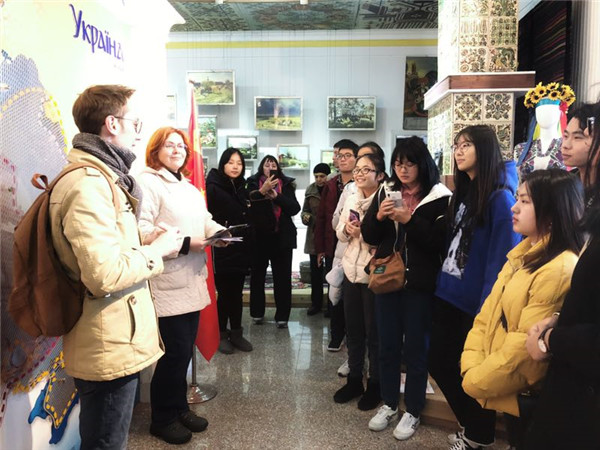 12月16日下午,学院第二届国际文化月在“乌克兰民俗之旅”活动中“收官”。十位热心参与第二届国际文化月活动的同学随学院外教Artur赴浙江师范大学一同参观乌克兰博物馆,特邀乌克兰籍外教Victoriya为同学们讲解展品背后的历史文化知识。