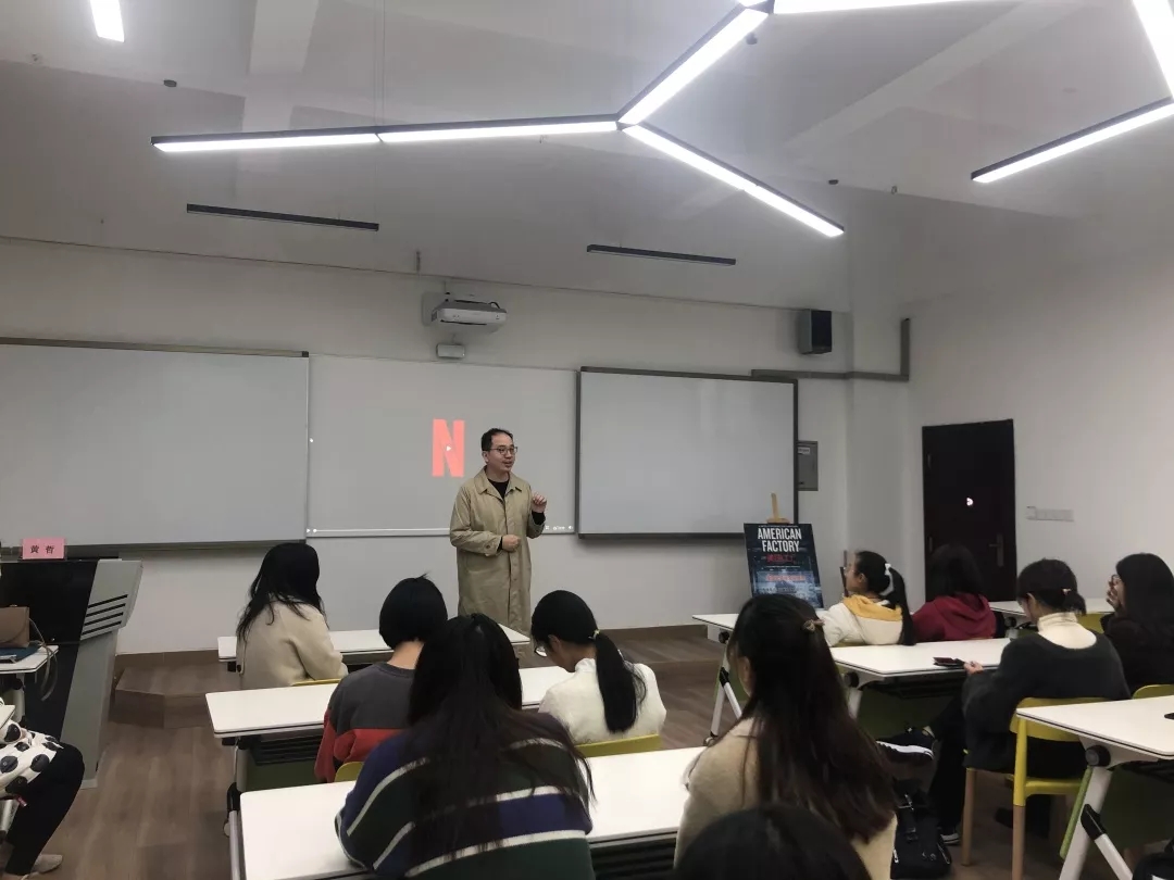 黄哲老师先是抛出中美文化有何不同这个问题引发同学们的思考,随之便直奔主题让同学们带着问题开始观看纪录片《美国工厂》。《美国工厂》是美国上届总统奥巴马旗下公司发行的一部纪录片,记录的是福耀玻璃集团在美国的办厂情况。该纪录片在中美贸易战的大背景下,将中美冲突、劳资冲突、人工与自动化的冲突的图景生动地展现出来。随着纪录片的放映,同学们的情绪也与纪录片联系在一起,时而为之欢呼,时而为之忧愁。在观影过程中,也对美国文化有了更深入的理解。