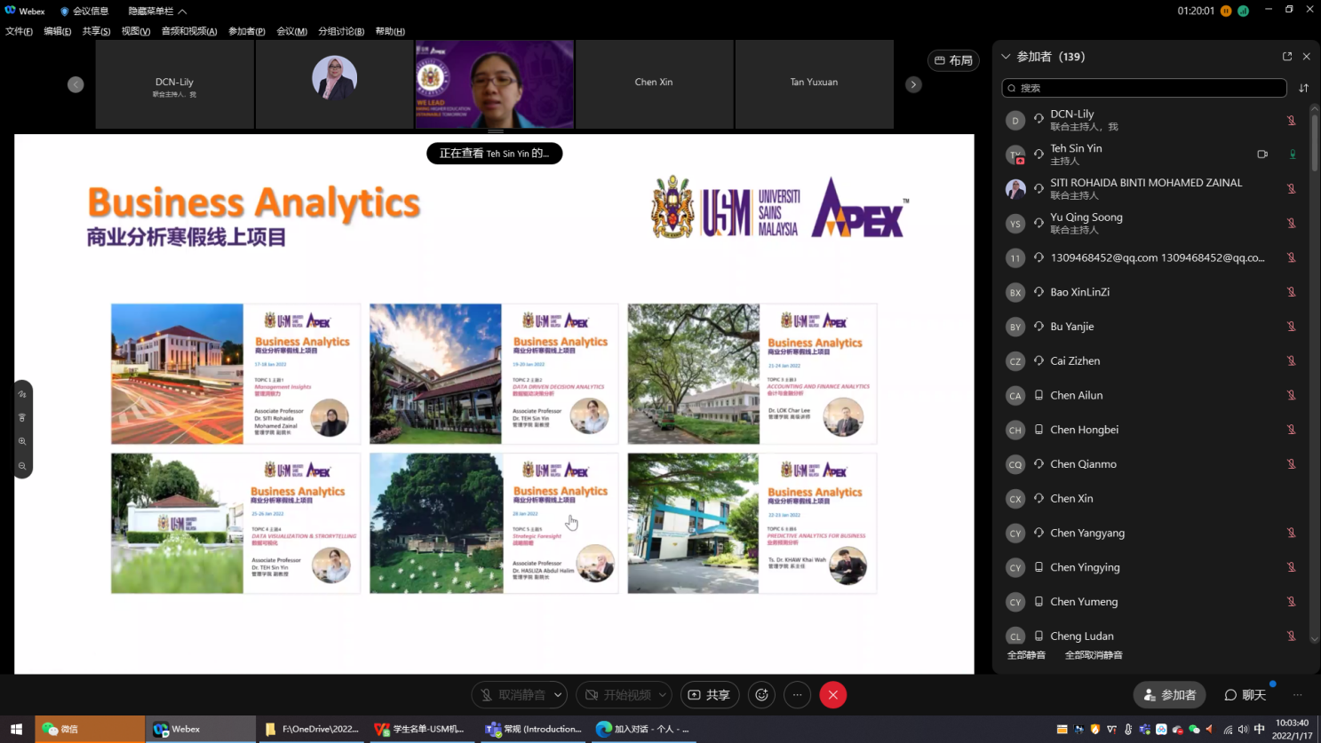 2022年1月17日至28日,上海财经大学浙江学院许栩桦等50名同学在通过了系部及学院的选拔后参加了学院首期马来西亚理科大学商业分析主题寒假线上课程。