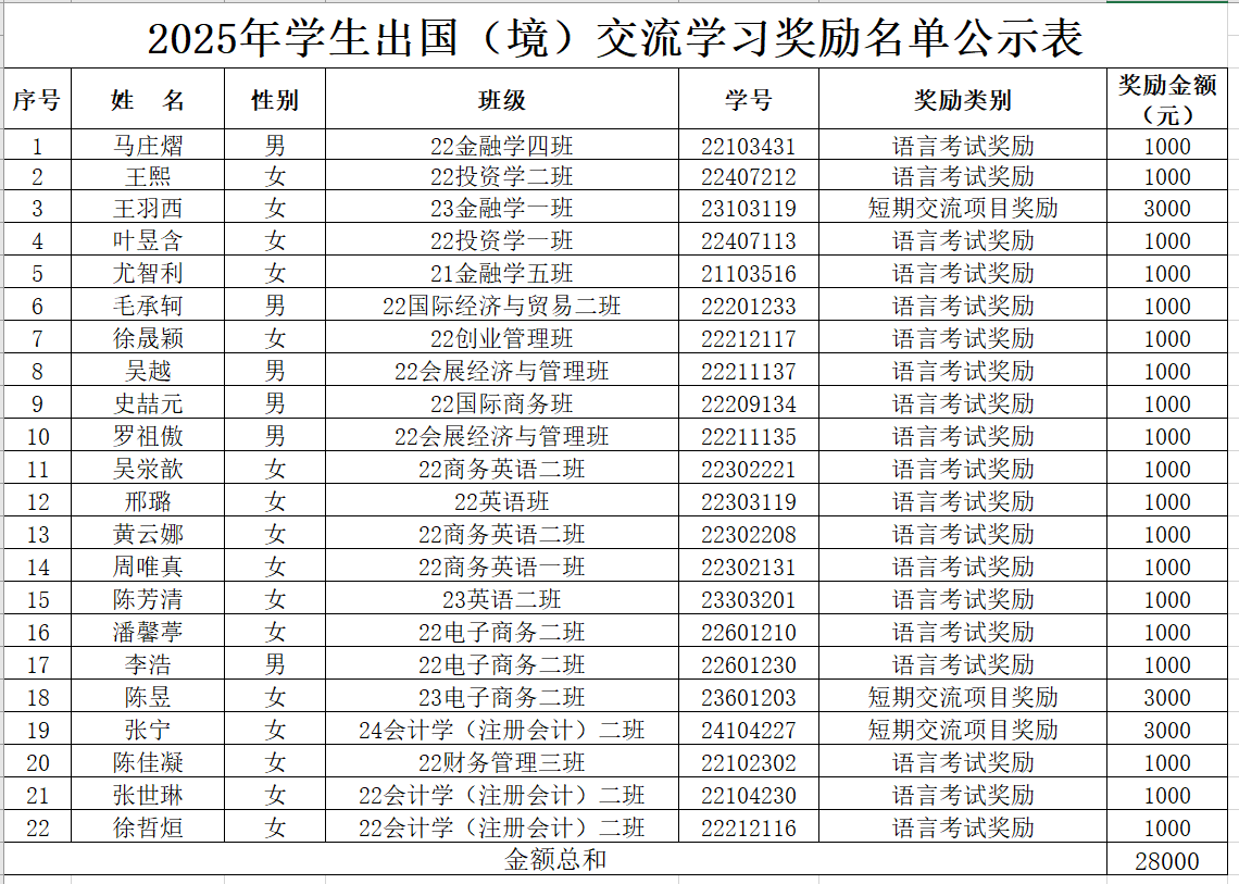 根据《上海财经大学浙江学院学生出国(境)交流学习奖励办法》(上财浙院〔2023〕34号),国际交流合作处于2025年11月份组织开展当年学生出国(境)交流学习奖励申报工作。各系(部)共提交23份出国(境)交流学习奖励金的申请,经国际交流合作处复核、抽查,奖励工作小组评议后,确定马庄熠等22名同学获得上海财经大学浙江学院出国(境)交流学习奖励金。